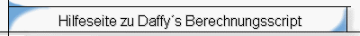 Anwendung dieser Hilfeseite Ich habe diese Hilfeseite zu Daffy´s Berechnungsscript als Image-Map erstellt. Das heißt, das auch dem Bild sehr viele Links sind. Diese Links sind immer die Eingabe- und Ausgabefelder, sowie die Buttons. Wenn ihr also Hilfe zu einem Eingabefeld oder sonstwas braucht, dann könnt ihr auf das entsprechende Feld klicken und es öffnet sich ein Popupfenster. Ich hoffe mal, ihr habt nicht alle einen Popupblocker installiert, sonst könnte sie evtl. nicht richtig funzen. Falls jemand Probleme wegen einen Popupblocker hat, dann kann er mit mir in Kontakt treten. | ||||||||||||||||||||||||||||||||||||||||||||||||||||||||||||||||||||||||||||